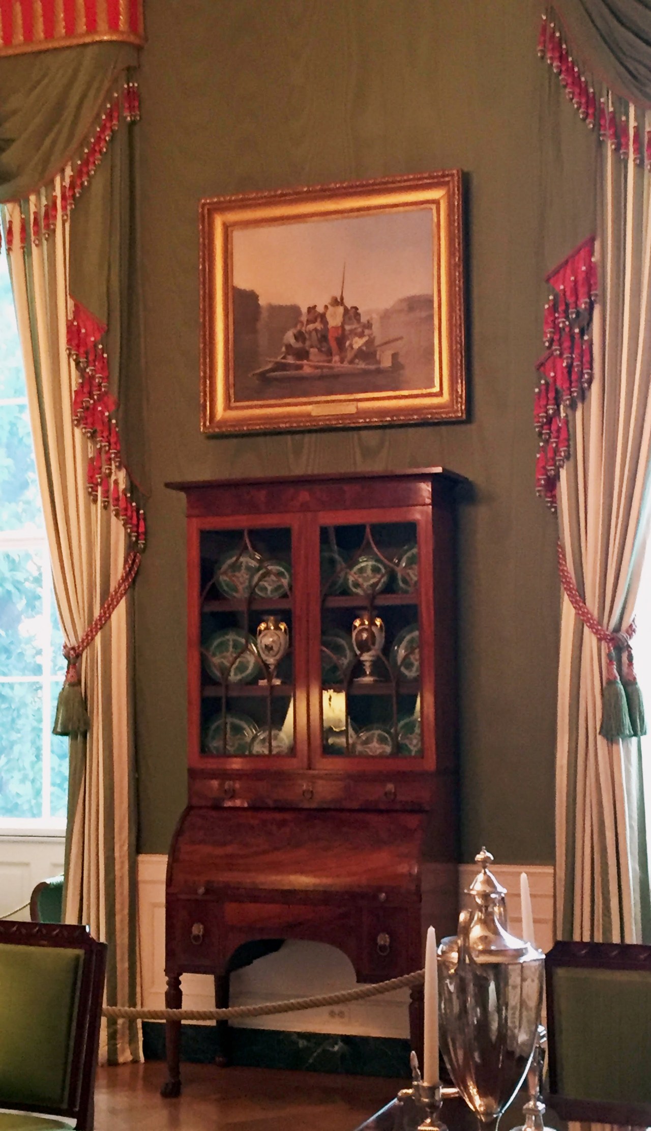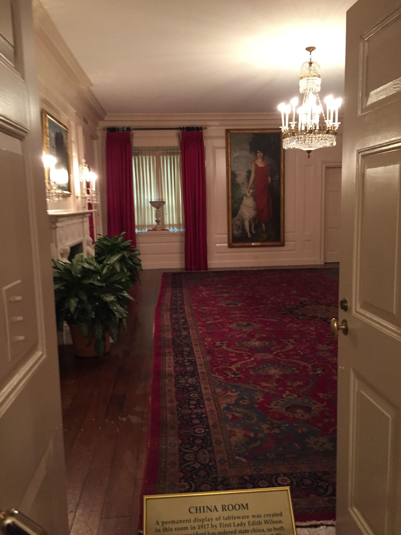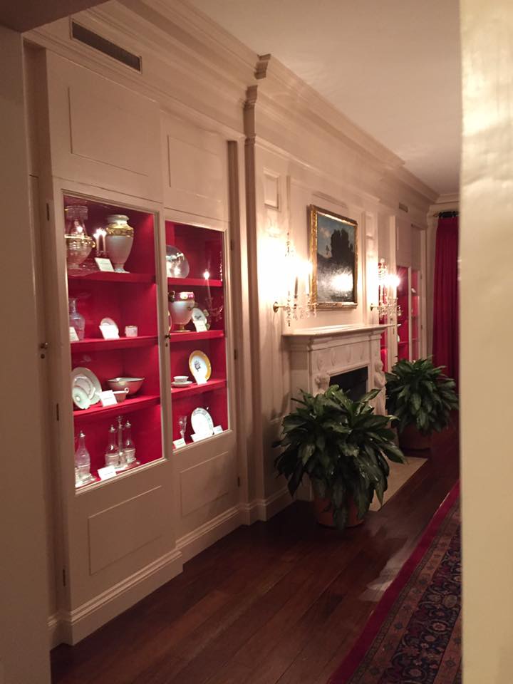 The China Room contains China from past administrations, but not all of it. Not every administration has their own pattern. There is so much China now that much of it is in storage. Any chipped or broken pieces used to be tossed into the Potomac. First Lady Edith Wilson began this display.