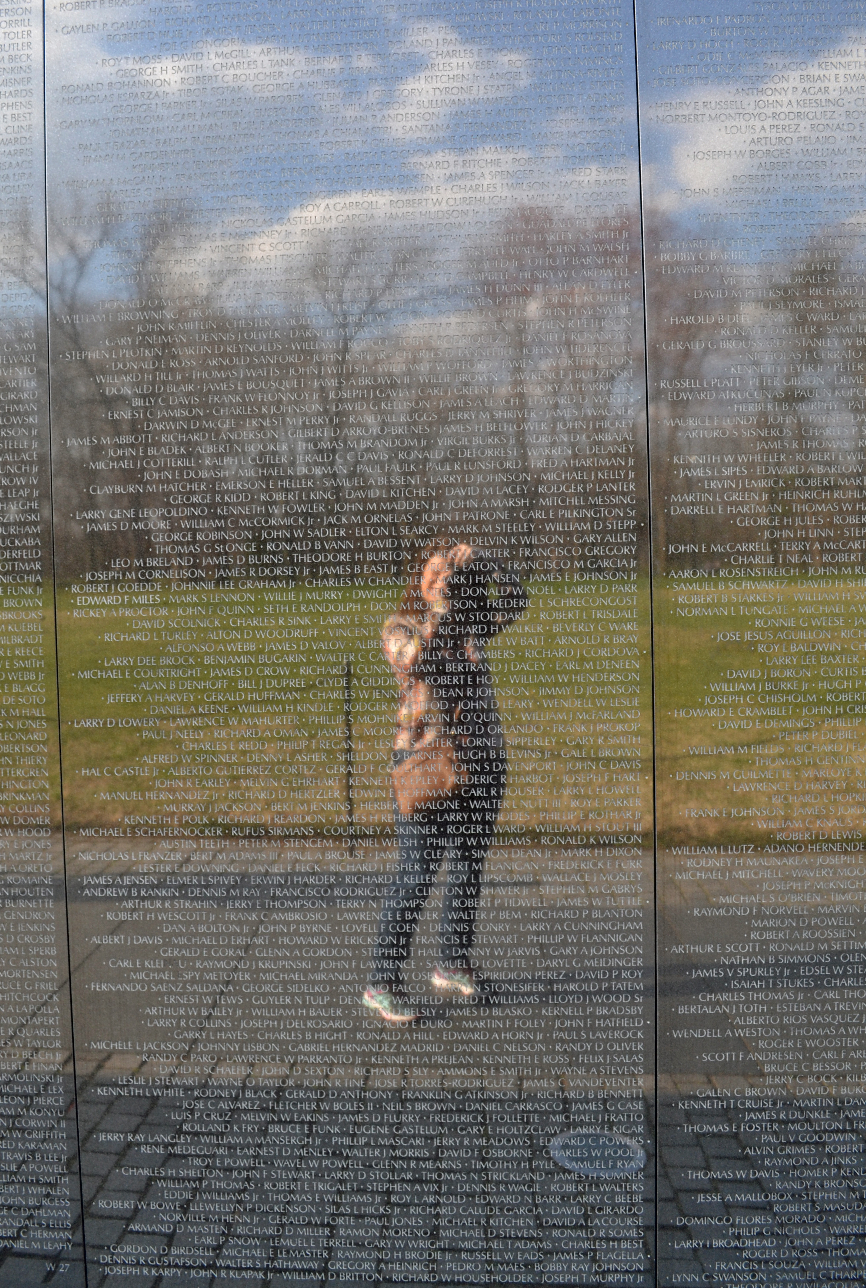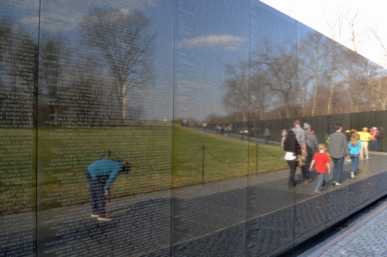 The Vietnam Memorial was a somber place. As a young girl, I saw an interview with Maya Lin, the designer of the Vietnam Memorial, on a program called Reading Rainbow. She described how she chose the material of gabbro because it is like a mirror when dry, but the reflective quality vanishes when wet. The names of the fallen are engraved on the wall and many people take a paper and pencil and make etchings of their loved one’s name. As you look at the wall, you can see a perfect reflection, which joins both past and present.