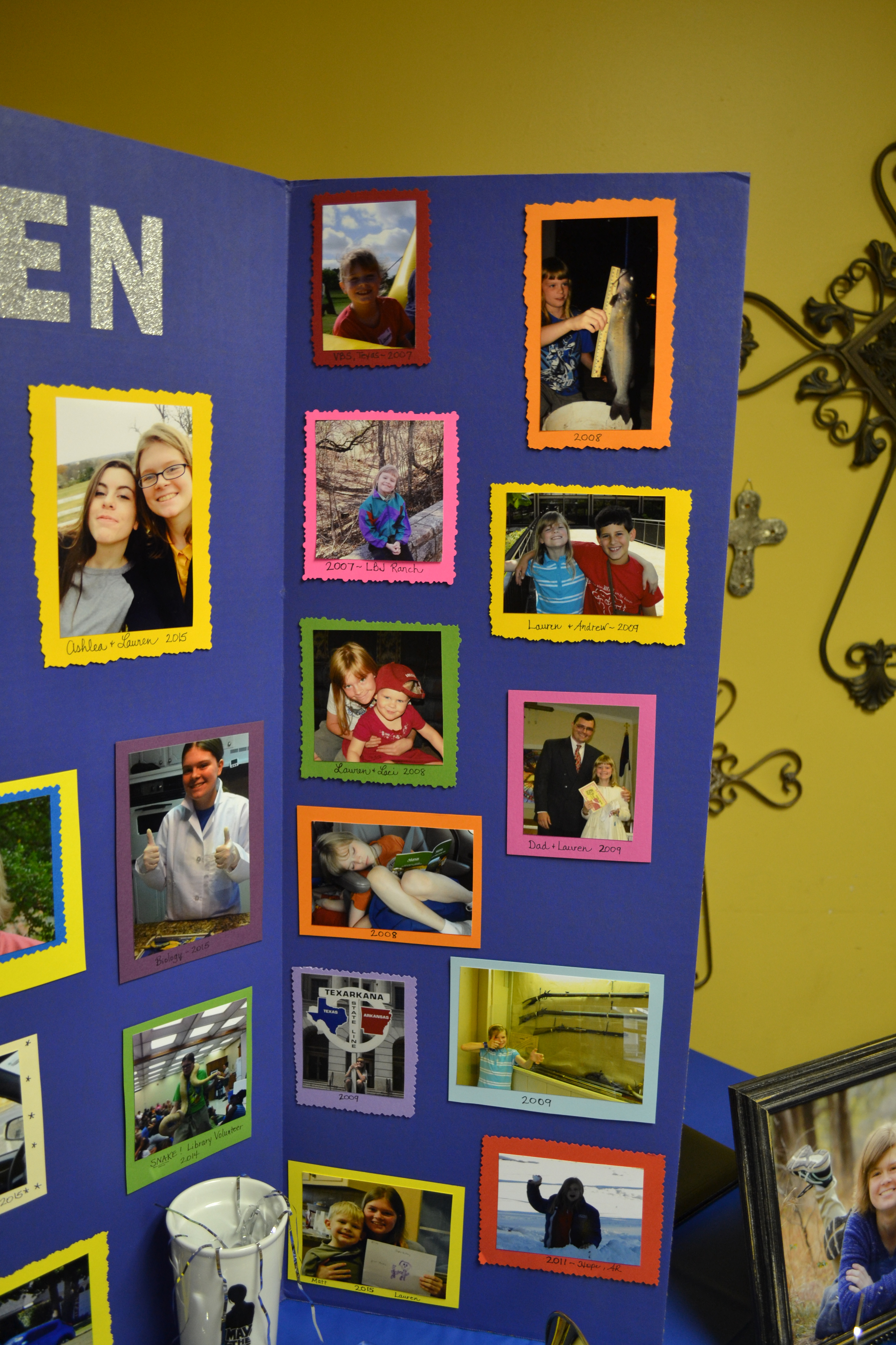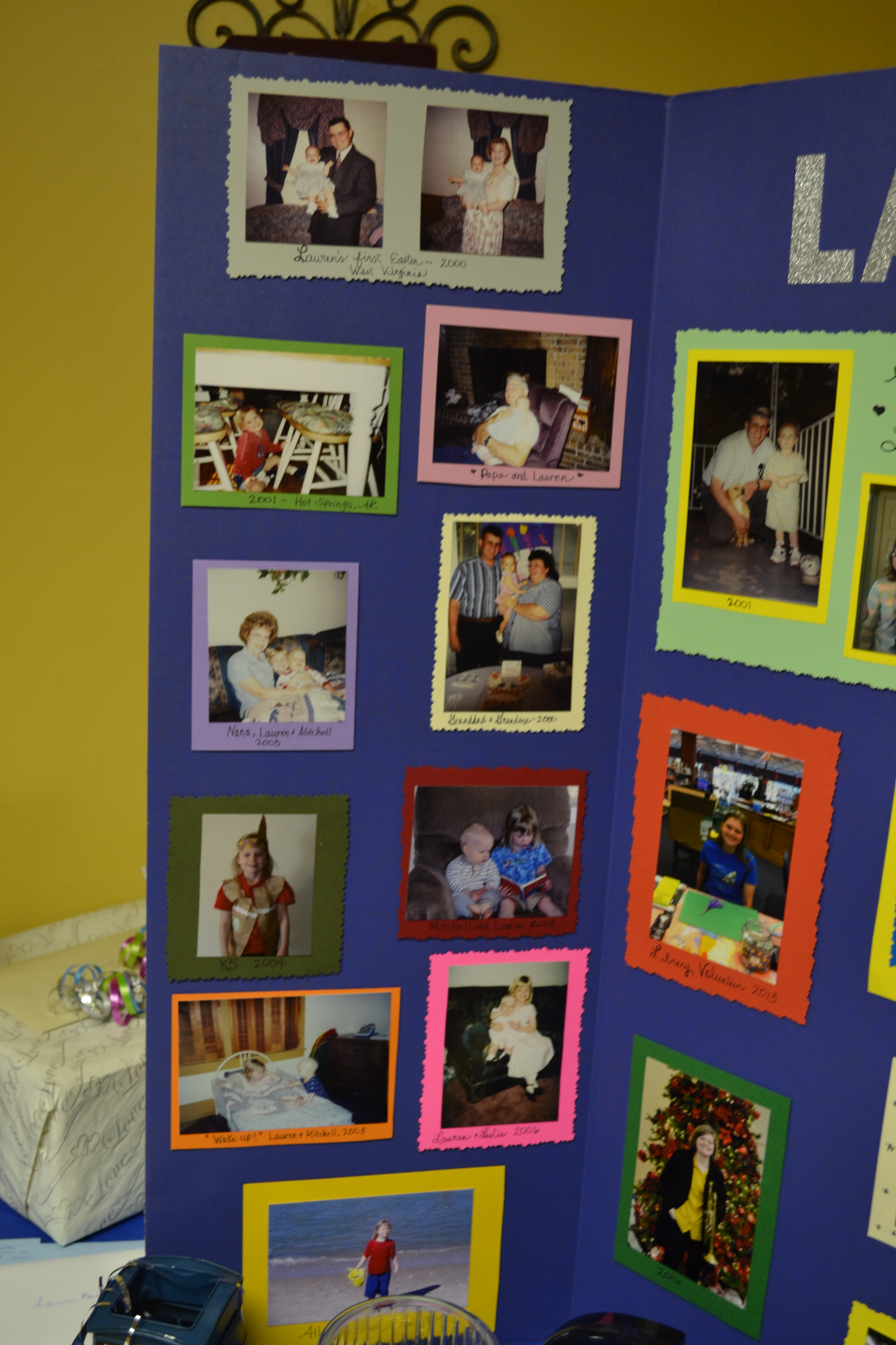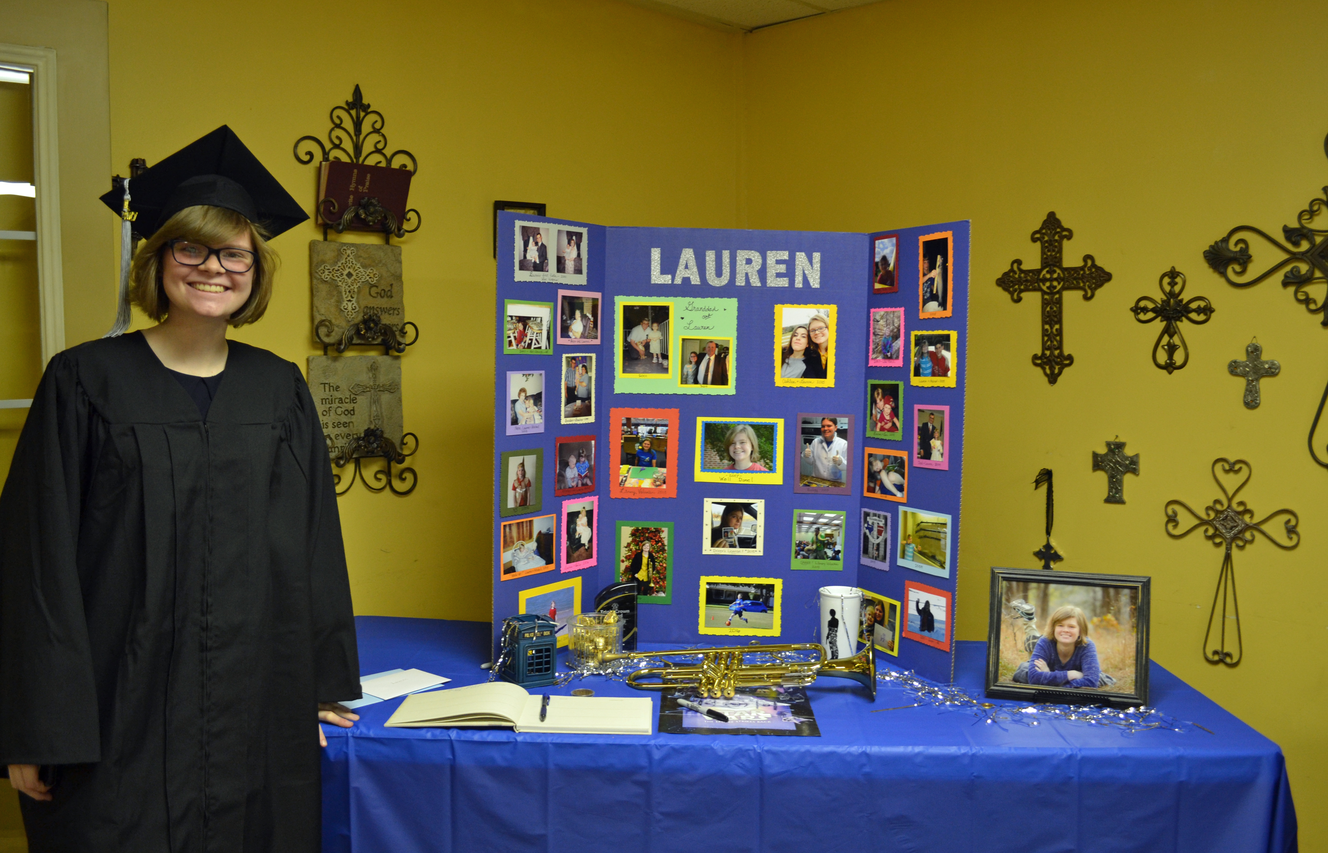 By far the hardest thing about planning the graduation was going through photo albums, searching for the photos that showcase Lauren’s life, accomplishments, and personality. I looked back and had some sadness, and then some happiness, then a bit more sadness…it was a roller coaster. I thought about things I wish I’d done, things I wish I hadn’t done, and so forth. I enjoyed being with her and raising her, but I know I didn’t do all the right things. I did the best I could. So, after sniffing and crying and wiping my eyes, I put the photos on a display board. I’d never done this before, but Lauren seemed quite pleased with it. We set out a few things she loves: the trumpet, Dr. Who, Star Wars, Reese’s Peanut Butter cups, and a guest book for our friends to sign.