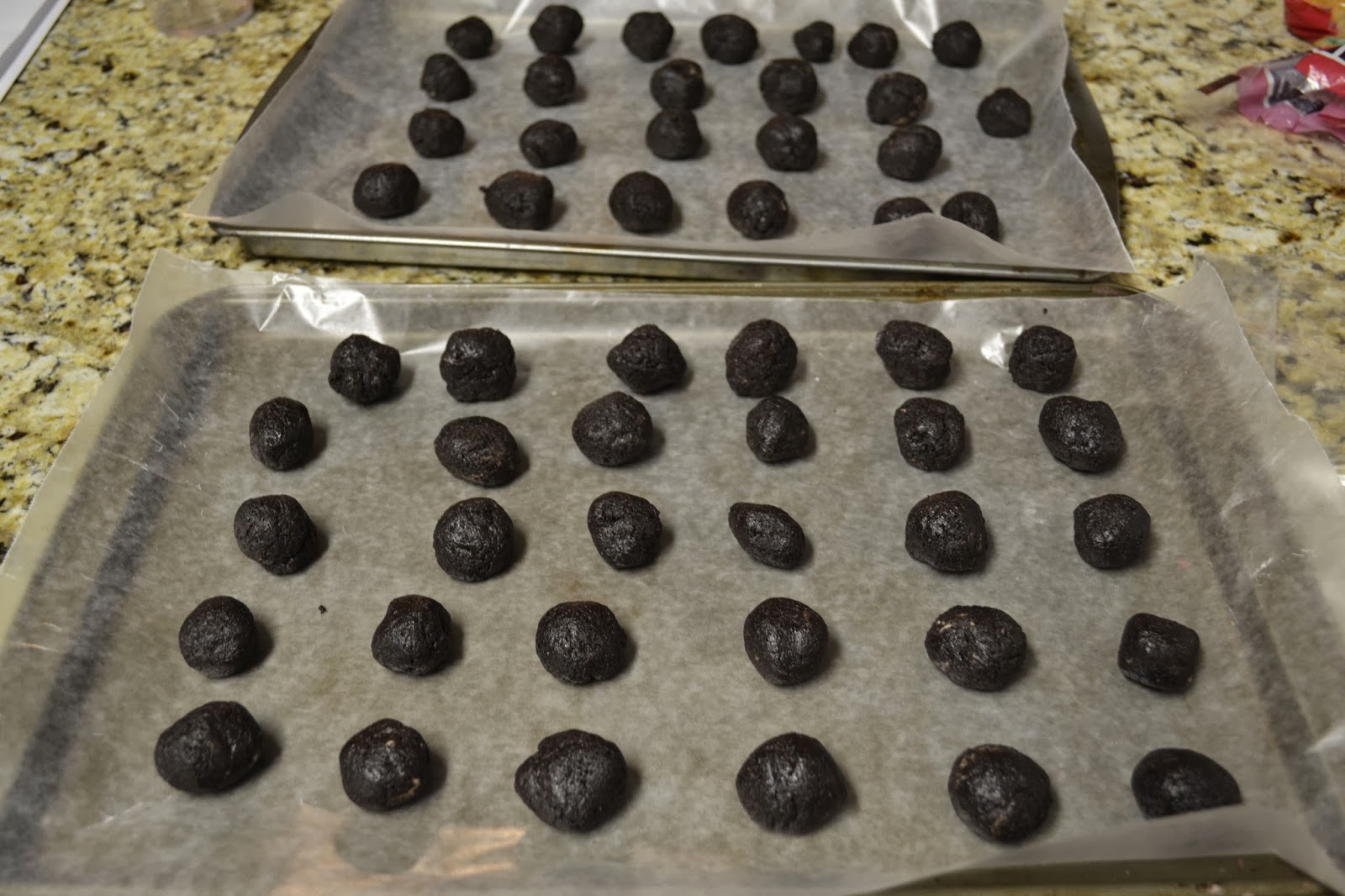 Next, roll the dough into at least 48 balls, place on wax paper [very important] and freeze them for about 10 minutes. If, by chance, you forget and leave them in the freezer for two hours, they will still be fine. 😉