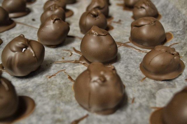 Melt the chocolate according to the package directions and start dipping them and placing them back on the wax paper. I didn’t get to photograph that step because I was intent on getting the job done quickly, but I used a bamboo skewer to dip them into the chocolate to make it a bit neater. I wanted to use toothpicks, but I didn’t have any.